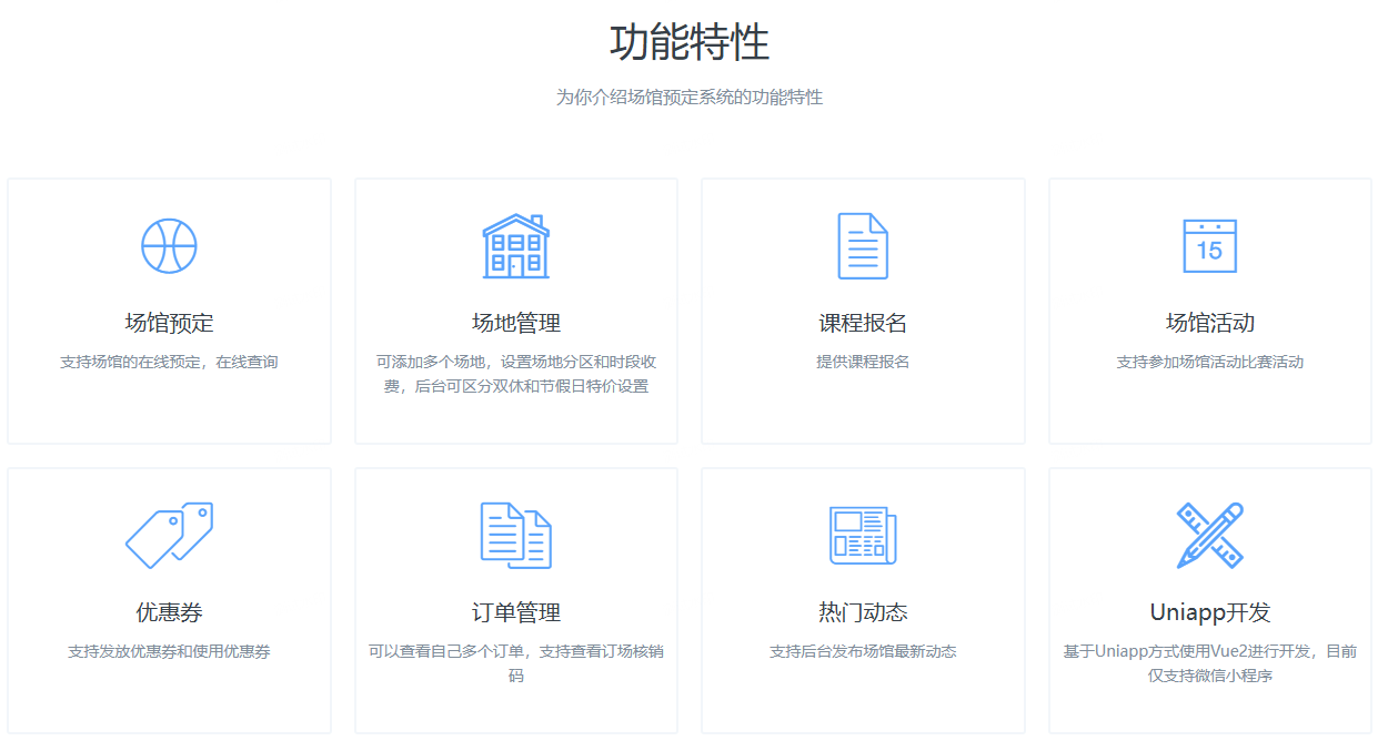 ### 程序介绍: | 程序名称 | 参考价格 | 程序类别 | 适用平台 | | -------- | -------- | -------- | ----------------- | | 场馆预定 | 399 | 独立部署 | 公众号\微信小程序 | --- #### 程序简介: 一款基于ThinkPHP+FastAdmin+UniApp开发的多场馆场地预定小程序,提供运动场馆运营解决方案,适用于体育馆、羽毛球馆、兵乒球馆、篮球馆、网球馆等场馆     --- #### 后台演示: motion2.51meteor.com/cDiswlxISQ.php/index/login?name=venue --- #### 前端/案列: #小程序://场馆预约/NzGLQEAqYDbcdfb  ---