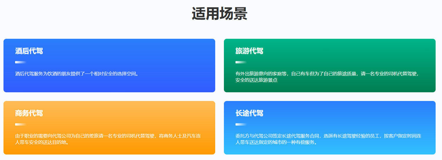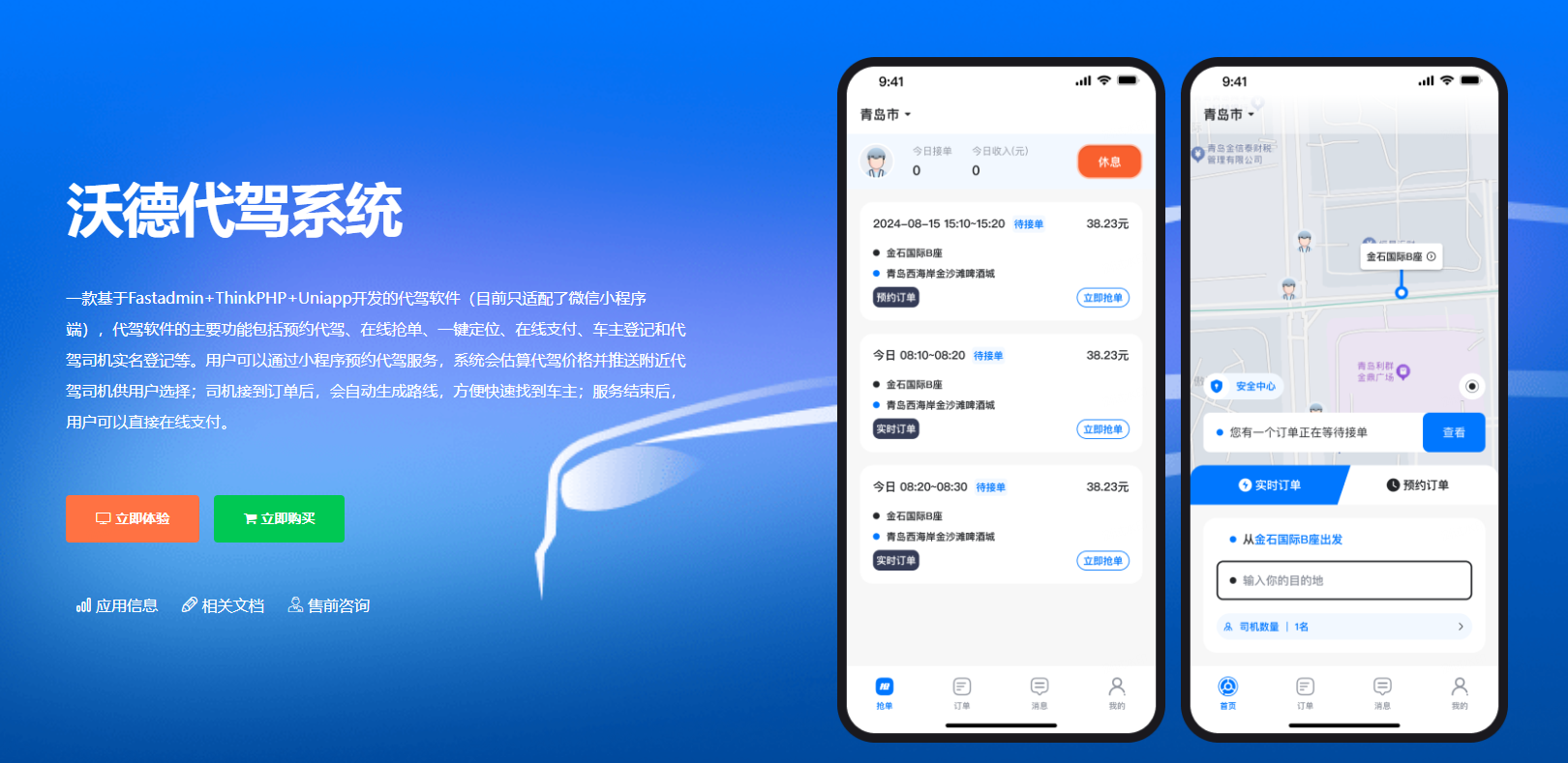 ### 程序介绍: | 程序名称 | 参考价格 | 程序类别 | 适用平台 | | ------------ | -------- | -------- | ---------- | | 沃德代驾系统 | 599 | 独立部署 | 微信小程序 | --- #### 程序简介: 预约代驾、在线抢单、一键定位、在线支付、车主登记和代驾司机实名登记等?。用户可以通过小程序预约代驾服务,系统会估算代驾价格并推送附近代驾司机供用户选择;司机接到订单后,会自动生成路线,方便快速找到车主;服务结束后,用户可以直接在线支付。独立部署,开源。   --- #### 后台演示: wddj.demo.qdmwd.cn/UCWrVNygfa.php/index/login https://hy1.ymsaas.com.cn/eINchAqiJB.php 账号:dj123456 密码:dj123456 --- #### 前端/案列:  ---