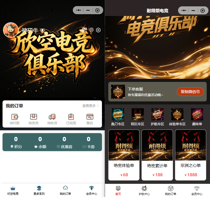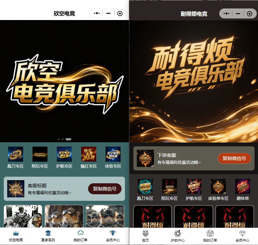 ### 程序介绍: | 程序名称 | 参考价格 | 程序类别 | 适用平台 | | -------- | -------- | -------- | ---------- | | 电竞护航 | 1499 | 独立部署 | 微信小程序 | --- #### 程序简介: 玩家体验拉满,从“打手大厅”选服务,到“个人中心” 查订单、!领优惠,界面简洁、操作丝滑,玩家下单像喝水一样自然,复购率想不高都难。数据面板实时洞察业务,店铺设置灵活调整,打手、订单管理清晰有序.. 一套系统,搞定电竞服务全流程,躺着也能把钱赚!   --- #### 后台演示: demo.pw.qianukj.com/admin 账号:admintest 密码:123456 --- #### 前端/案列: #小程序://欣空/2ckNuRpG3DlI4xm #小程序://耐得烦电竞/TY8rJPOczBzrTxj ---