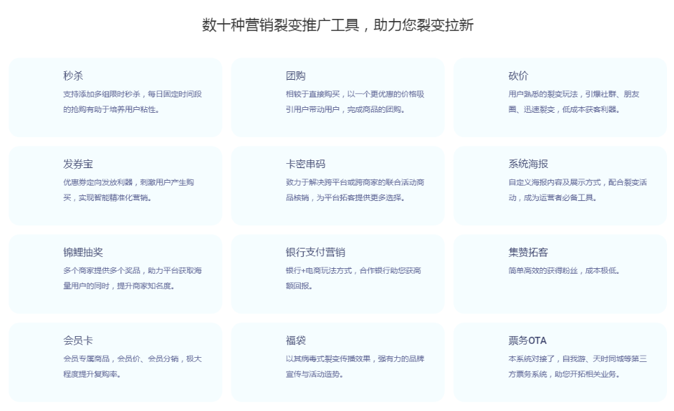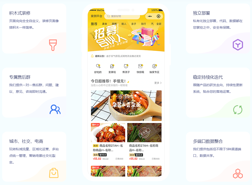 ### 程序介绍: | 程序名称 | 参考价格 | 程序类别 | 适用平台 | | ------------ | -------- | ------------ | -------- | | 零点城市电商 | 399 | SAAS | 小程序 | | 零点社交电商 | ~~///~~ | 独立部署开源 | 小程序 | --- #### 程序简介: 零点城市社交电商是专为本地中小商家、城市自媒体及区域运营商打造的全渠道社交电商 SaaS 系统,以 “跨平台引流 + 社交裂变 + 数据化运营” 为核心逻辑,通过小程序、公众号等多载体整合,解决传统本地商家 “获客渠道单一、用户粘性弱、运营效率低” 的痛点。系统定位为 “城市级生活服务电商中枢”,既提供轻量化的店铺搭建与营销工具,又支持私域流量沉淀与全链路数据洞察,覆盖 “引流 - 转化 - 留存 - 复购” 的本地商业经营闭环。    --- #### 后台演示: ld.lugekf.com 账号:yanshi 密码:yanshi --- #### 前端/案列: #小程序://更享花/Y4YmbC2yhCor60n #小程序://小嘻派/FP3JenHDVG62XUF ---