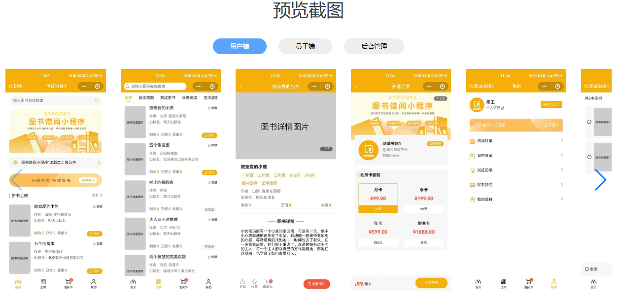 ### 程序介绍: | 程序名称 | 参考价格 | 程序类别 | 适用平台 | | -------------- | -------- | -------- | ---------- | | 图书借阅小程序 | 499 | 独立部署 | 微信小程序 | --- #### 程序简介: 开发的图书借阅微信小程序,多书馆切换模式,书馆一键同步图书信息,开通会员即可在线借书,一书一码书馆员工手机扫码出入库从会员到书馆每一步信息把控,提供全部无加密源代码,支持私有化部署。   --- #### 后台演示: https://yanshi.youmahx.cn/SpWwPqhbfn.php 账号:tushu888 密码:tushu888 --- #### 前端/案列: #小程序://行云图书借阅/h09x8csvtw1Slmn ---