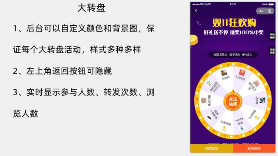 ### 程序介绍: | 程序名称 | 参考价格 | 程序类别 | 适用平台 | | ------------ | -------- | -------- | -------- | | 新版抽奖系统 | 299 | SAAS | | --- #### 程序简介: 新版抽奖系统 支持微信小程序,含抽奖,砍价,盲盒,转盘抽奖,九宫格抽奖,集卡,红包封面,拼团,积攒,红包雨等多种营销功能                   --- #### 后台演示: cj.ymsaas.com.cn 账号:yanshi 密码:yanshi --- #### 前端/案列: ---