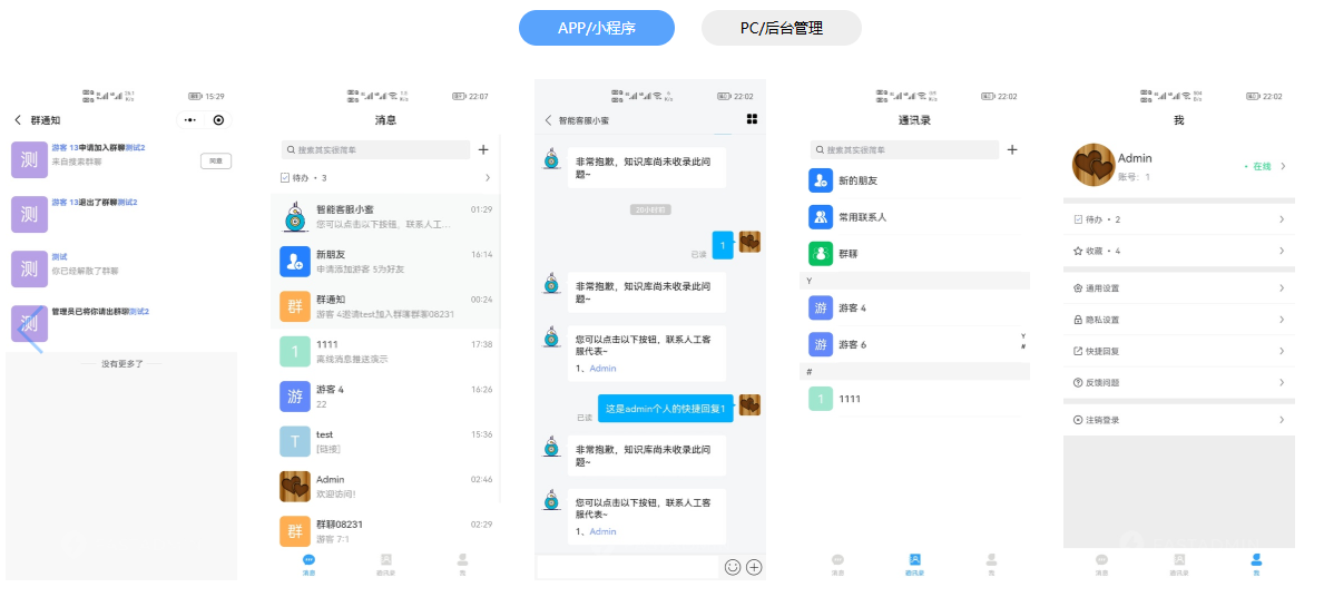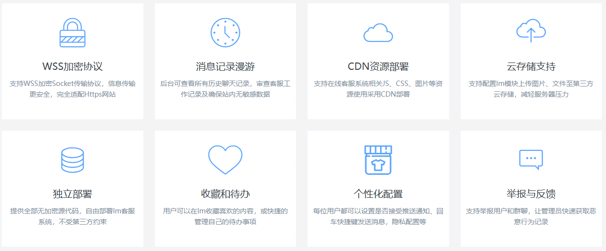 ### 程序介绍: | 程序名称 | 参考价格 | 程序类别 | 适用平台 | | -------------- | -------- | -------- | ------------- | | 企业IM客服系统 | 299 | 独立部署 | H5/微信小程序 | --- #### 程序简介: 基于ThinkPHP5+FastAdmin+Swoole开发的一款即时通讯和客服系统、支持会员、管理和游客相互之间的即时通讯、群聊、支持多客服(不限坐席)、智能客服、APP离线消息推送、历史消息、uni-app接入。 提供全部无加密服务端源码和前端源代码,独立部署,不受限制。    --- #### 后台演示: https://im.thankphp.com/WYfVGLKcoF.php/dashboard?ref=addtabs --- #### 前端/案列: https://im.thankphp.com/h5/pages/center/login  ---