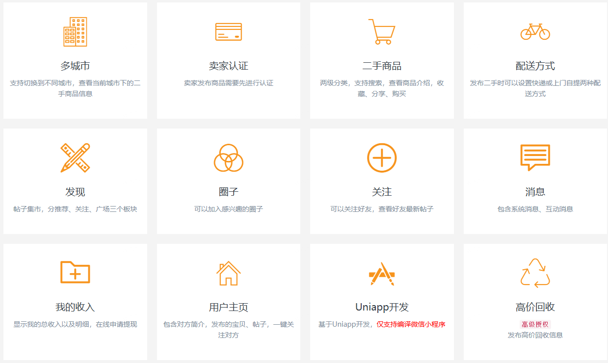 ### 程序介绍: | 程序名称 | 参考价格 | 程序类别 | 适用平台 | | ---------------- | -------- | -------- | ---------- | | 西陆二手交易系统 | 399 | 独立部署 | 微信小程序 | --- #### 程序简介: 一款基于Uniapp+FastAdmin+ThinkPHP开发的二手交易系统,卖家可以发布二手信息,买家可以在线询价,支持在线聊天(高级授权),在线购买支付,支持发布高价回收(高级授权)信息。自带社交板块,用户可以发布帖子、加入圈子、关注好友。Uniapp仅支持编译微信小程序。    --- #### 后台演示: ximarket.xilushop.com/dVrKnFEBWa.php/index/login --- #### 前端/案列: #小程序://西陆二手交易/5ekKRqFhAdilxSc ---